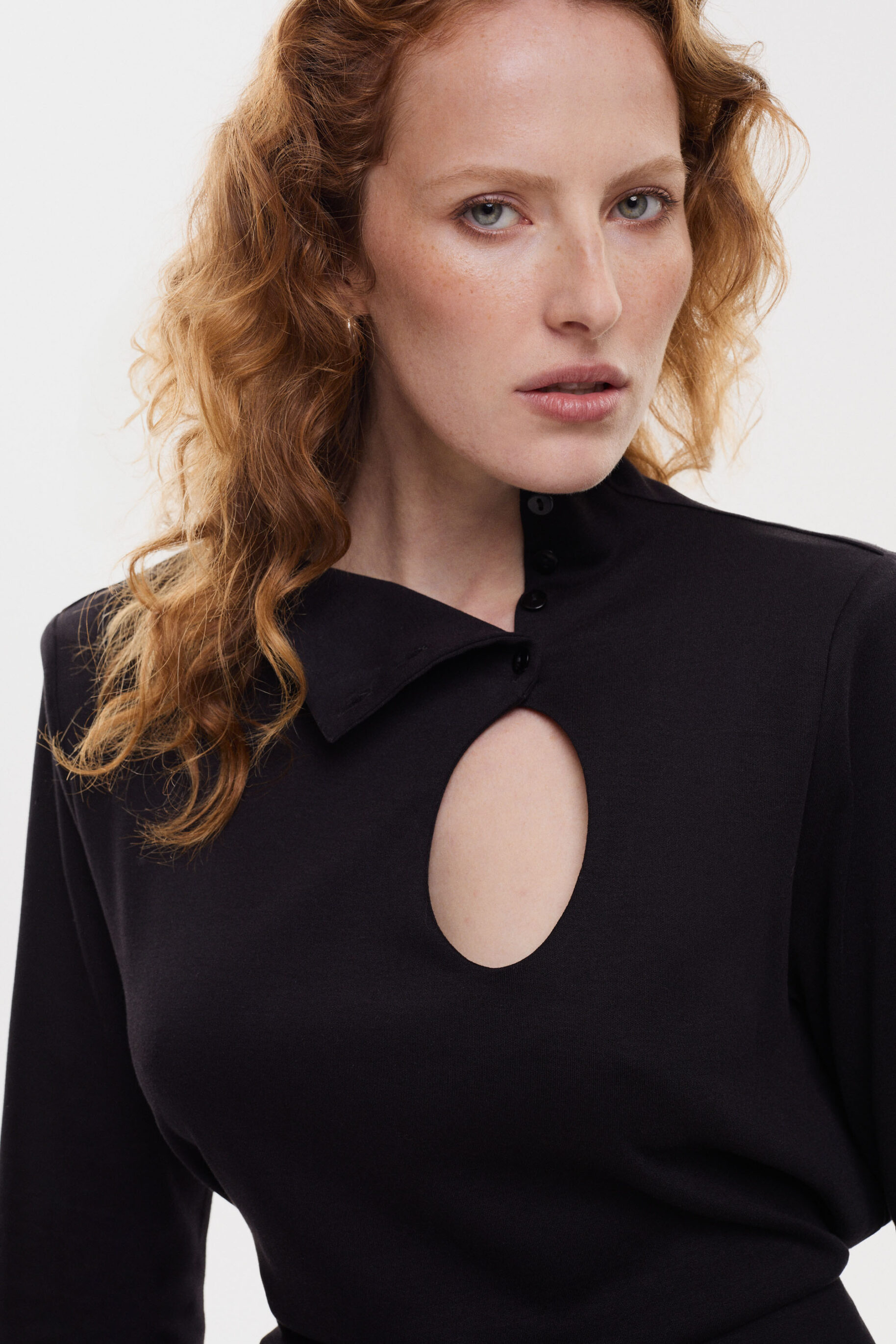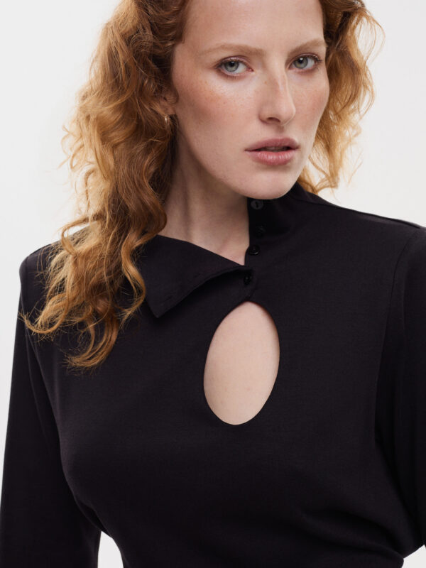 - Dekolt w łezkę oraz stójka zapinana na guziczki