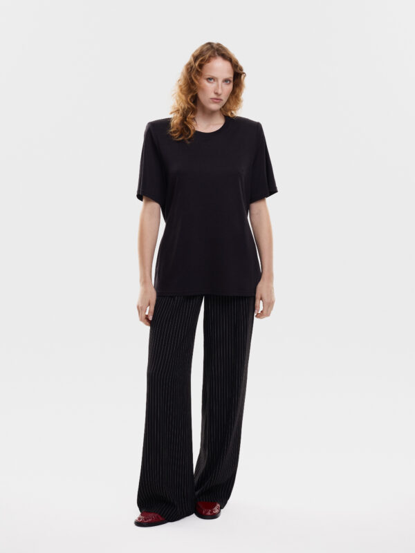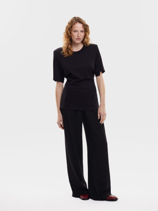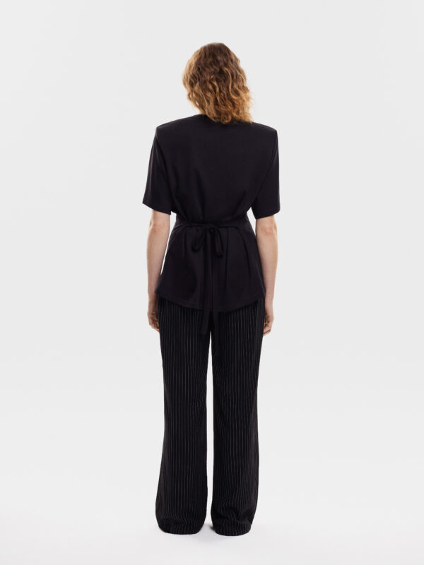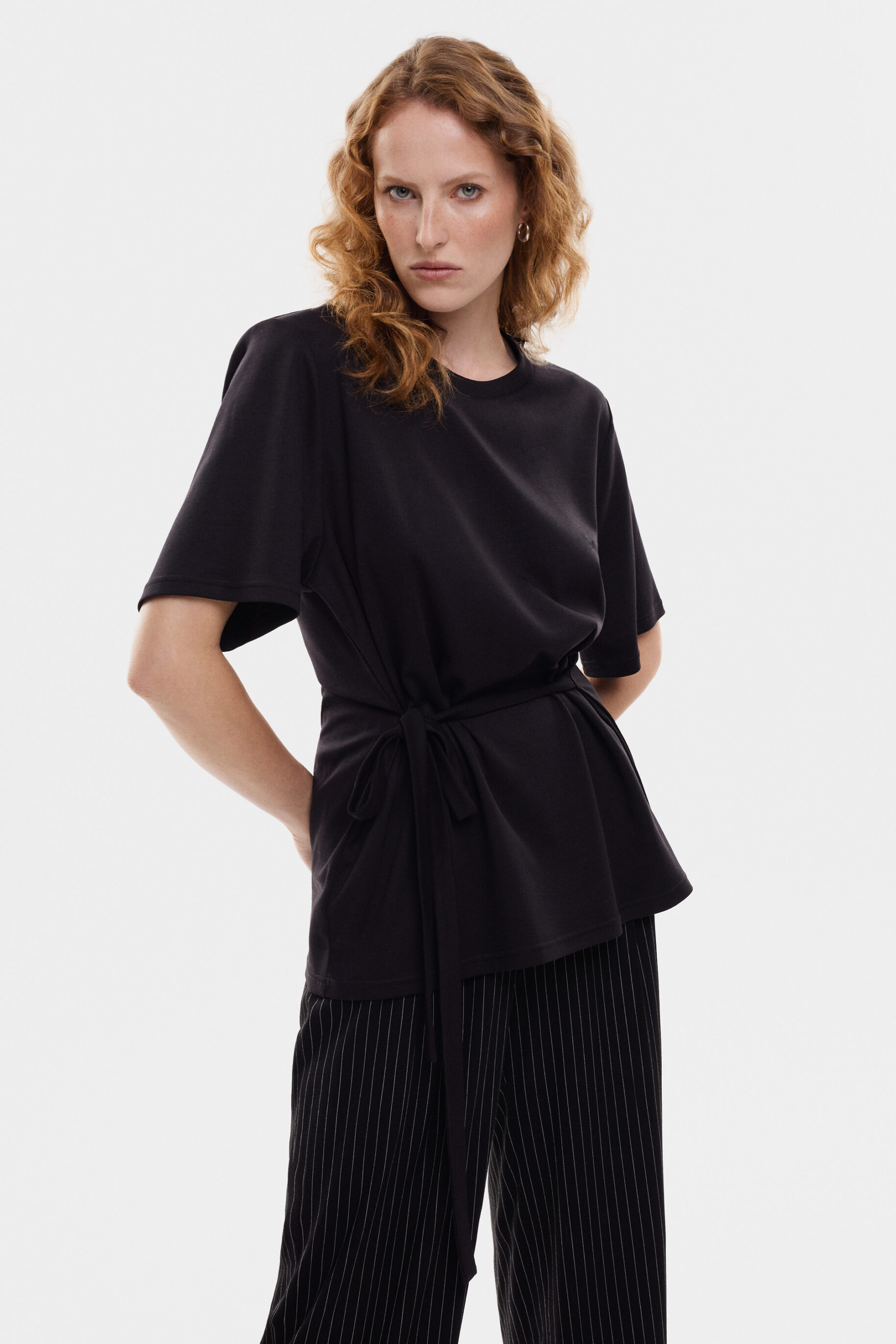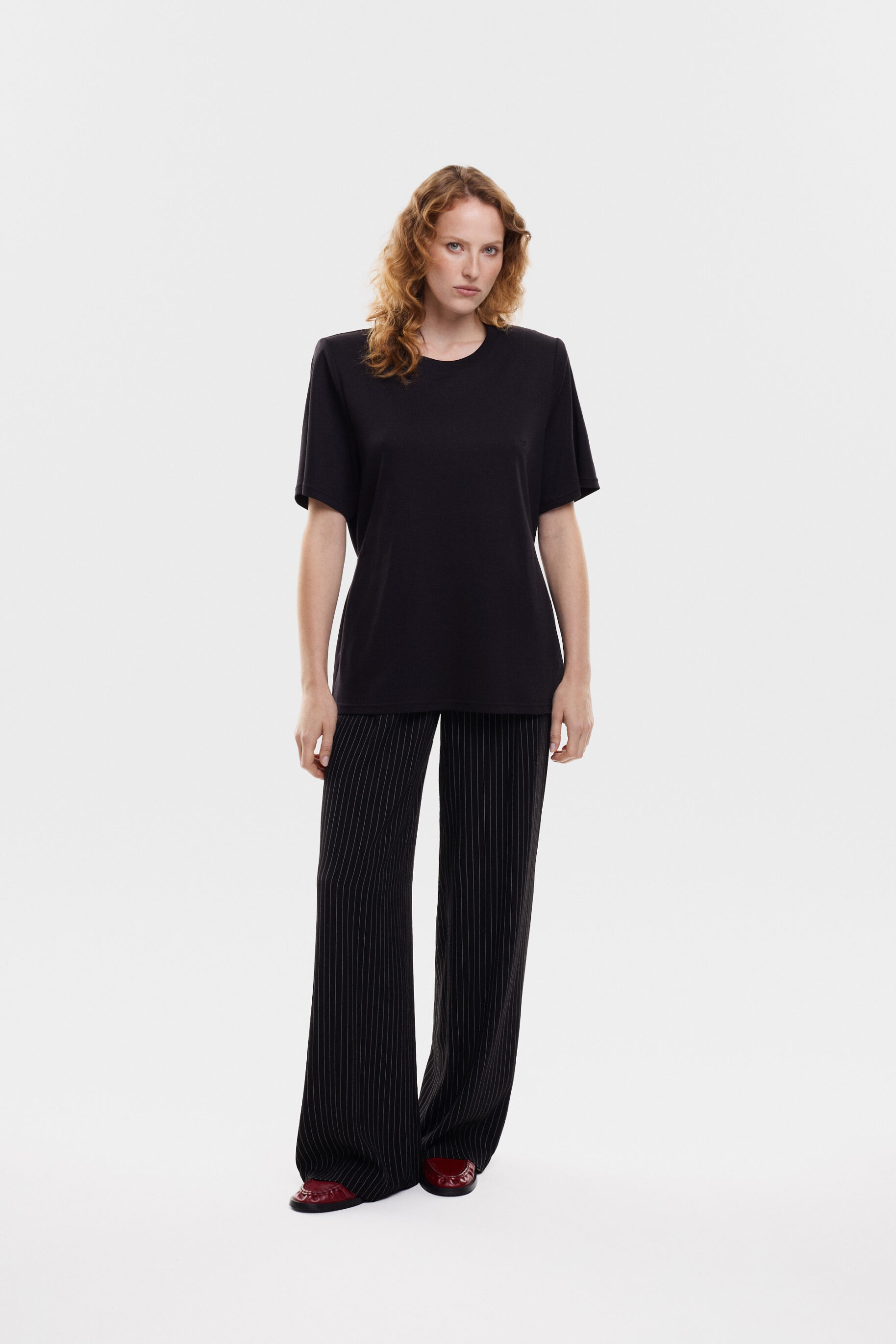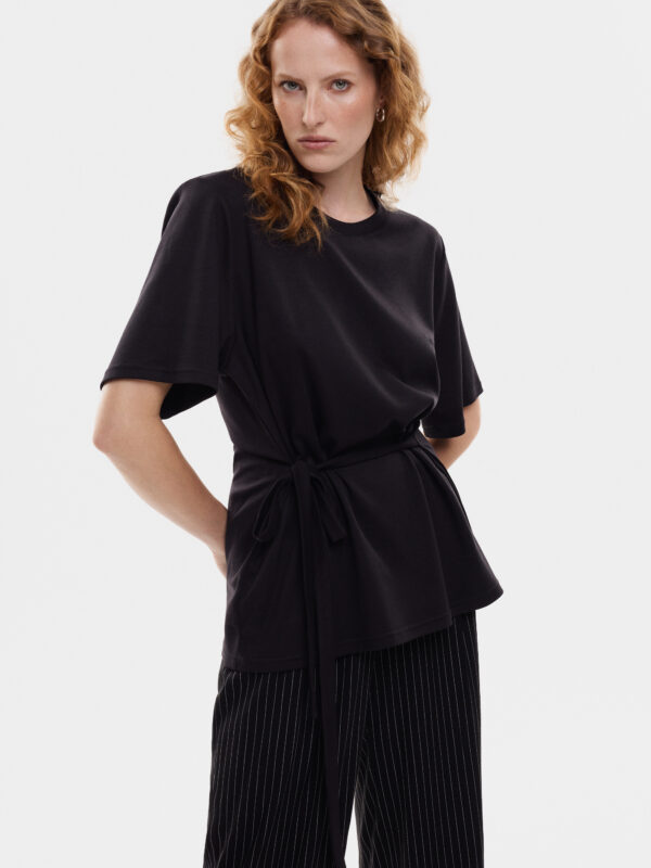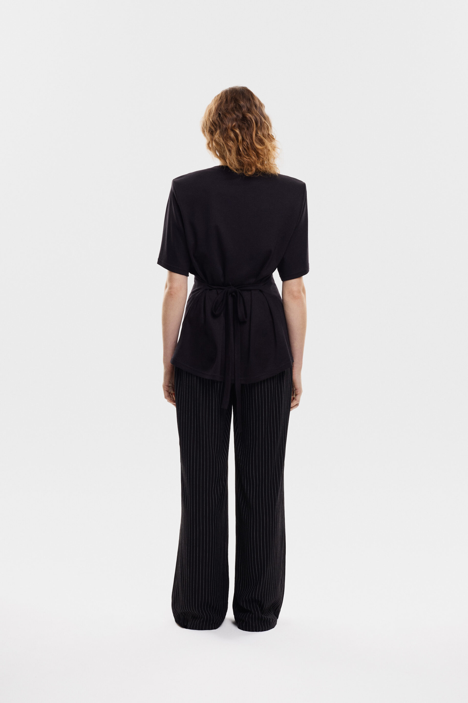 The 3in1 Bamboo Cotton T-Shirt to nasza odpowiedź na klasyczny T-shirt. Łączy minimalistyczną formę z wyjątkowymi detalami, które nadają mu unikalny charakter. Dzięki wiązaniu z tyłu możesz perfekcyjnie dopasować go do swojej sylwetki – podkreślić talię, zawiązać luźniej dla efektu oversize lub przewiązać z przodu, tworząc oryginalny akcent. Model został wyposażony w odpinane poduszki w ramionach, które pozwalają na dowolne modelowanie sylwetki. Noś go z poduszkami dla podkreślenia lini ramion lub bez, stawiając na bardziej swobodny look. To uniwersalna baza do codziennych i eleganckich stylizacji. Stwórz idealny zestaw w połączeniu ze Suit Pants, or jeansami Denim.