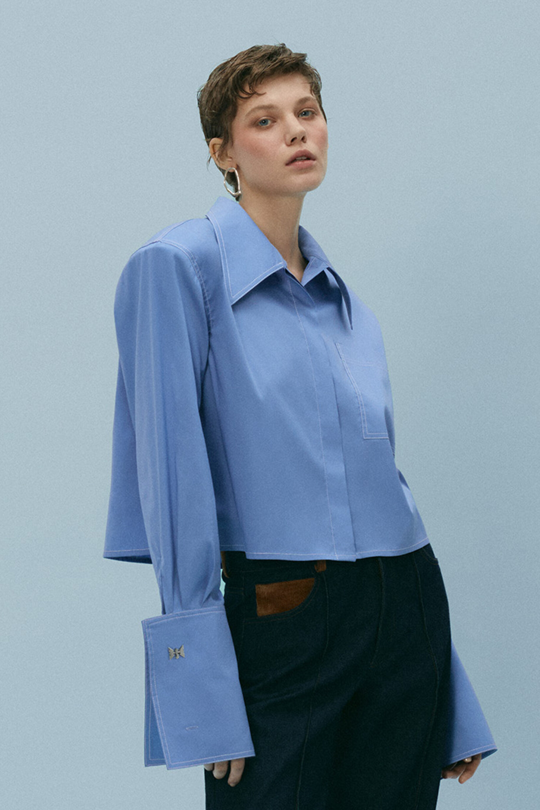 Koszula Blue Crop łączy w sobie minimalistyczny charakter, wygodę i wyraziste detale, idealnie wpisując się zarówno w codzienne, jak i bardziej eleganckie stylizacje. Model został wyposażony w odpinane poduszki w ramionach, które pozwalają na dowolne modelowanie sylwetki. Noś ją z poduszkami dla podkreślenia lini ramion lub bez, stawiając na bardziej casualowy look. Szerokie mankiety zapinane na spinki naszego projektu możesz stylizować na wiele sposobów. Złóż je na pół i zapnij na jedną spinkę, aby subtelnie podkreślić nadgarstek. Dla większej swobody rozłóż mankiety i zapnij na jedną spinkę lub pozostaw je całkowicie rozpięte.