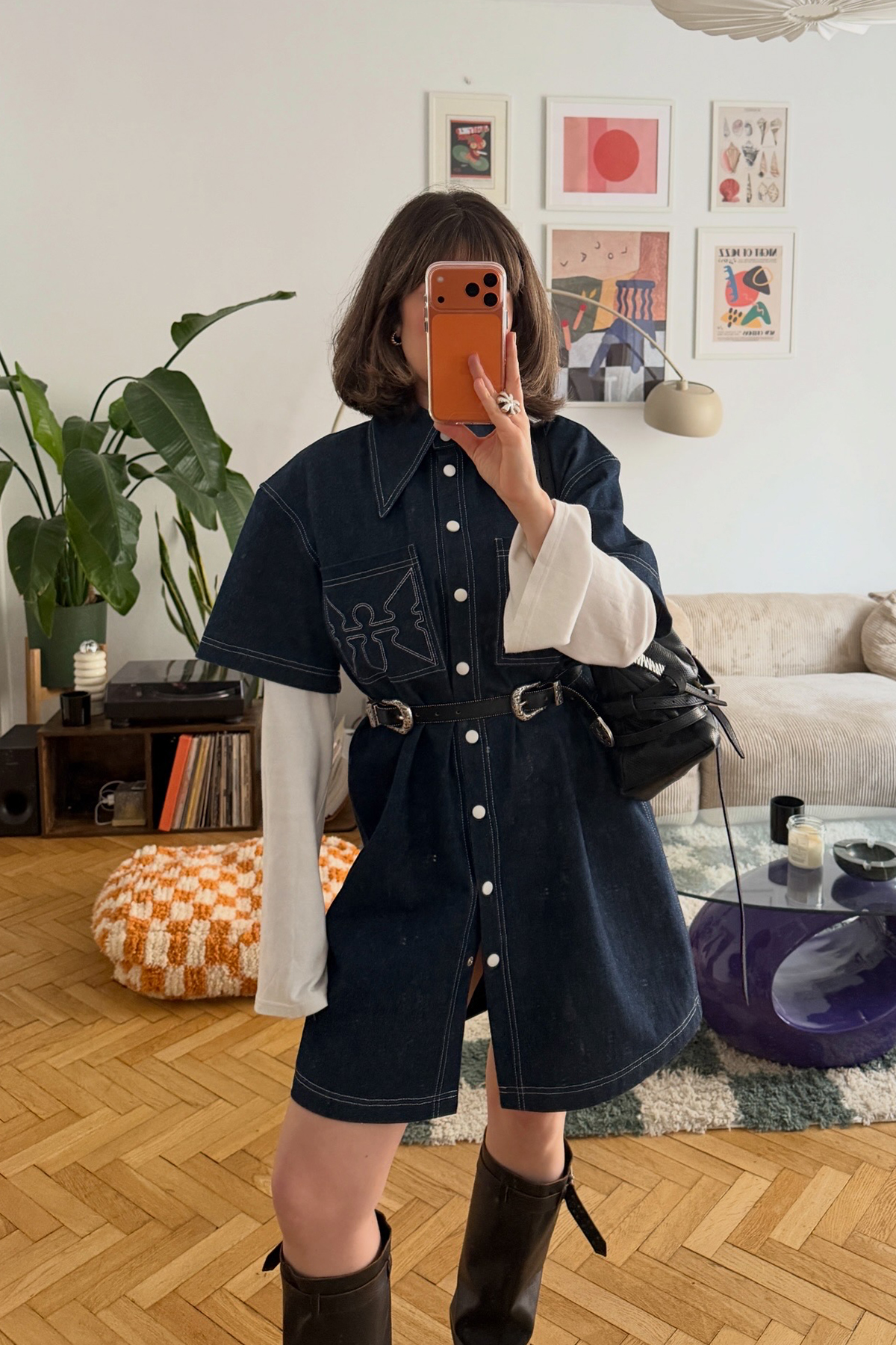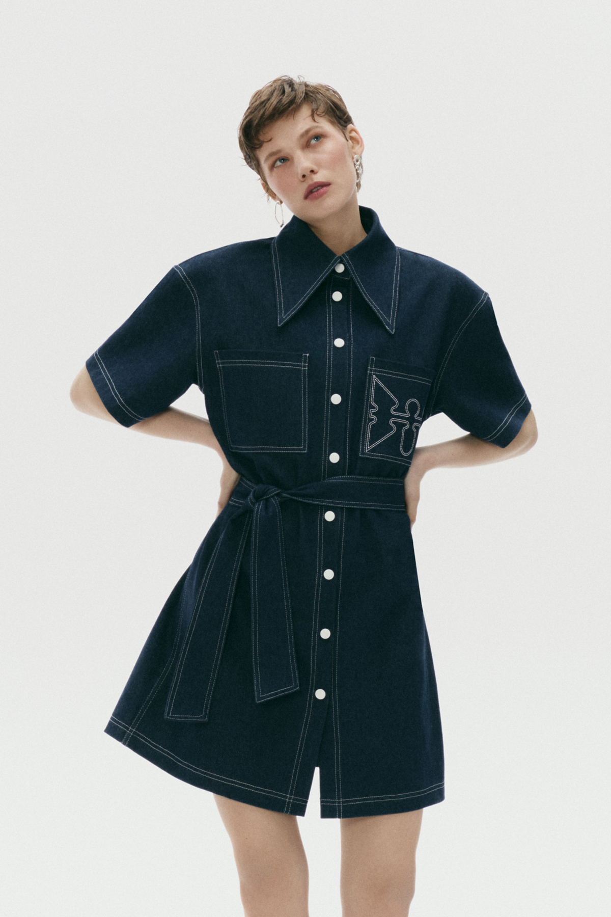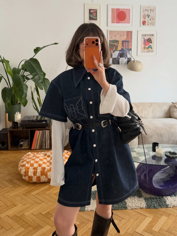 - Sukienka koszulowa z ciemnego jeansu o luźnym kroju