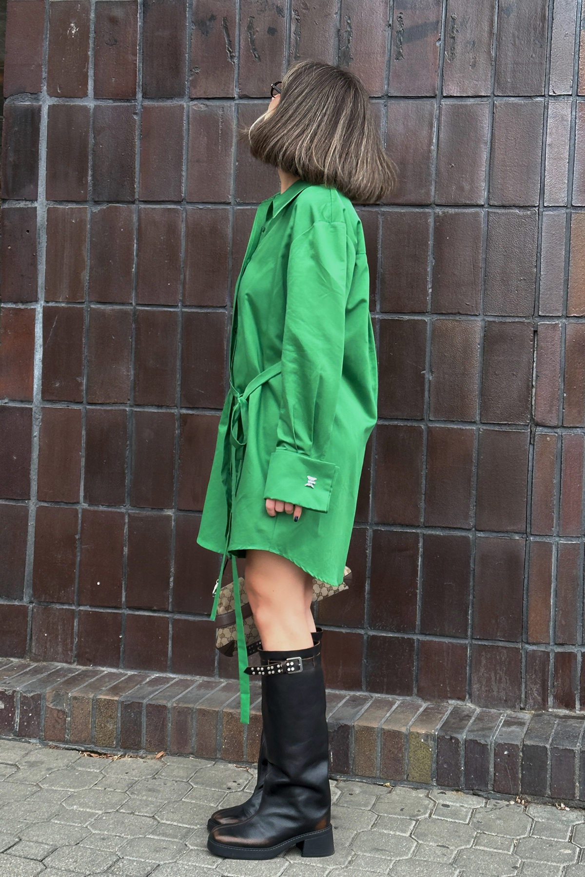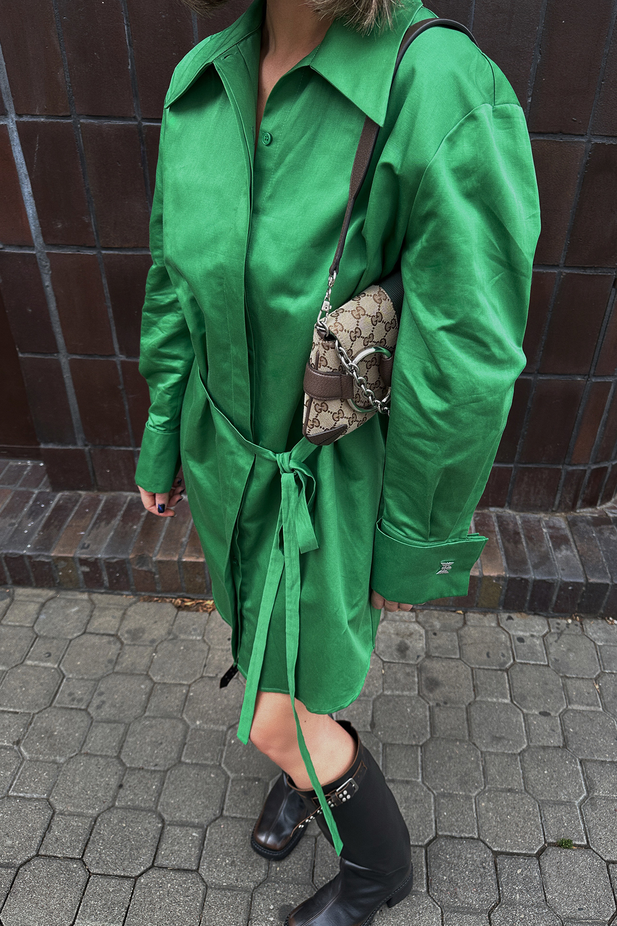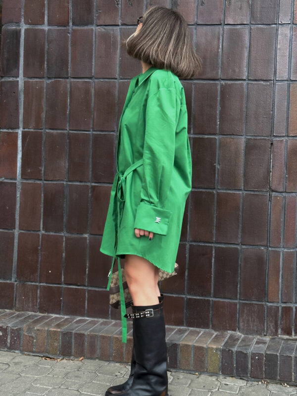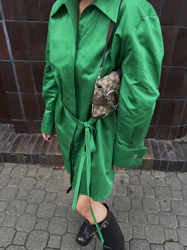 Sukienka GREEN to model o ponadczasowym kroju koszulowym, który doskonale sprawdzi się zarówno na co dzień, jak i na wyjątkowe okazje. Dzięki wiązaniu z tyłu możesz perfekcyjnie dopasować ją do swojej sylwetki, podkreślając talię lub nosić zawiązaną luźno, uzyskując bardziej oversize look. Szerokie mankiety zapinane na spinki naszego projektu możesz stylizować na wiele sposobów. Złóż je na pół i zapnij na jedną spinkę aby subtelnie podkreślić nadgarstek. Dla większej swobody rozłóż mankiety i zapnij na jedną spinkę. Sukienkę można nosić również rozpiętą do topów i szortów.