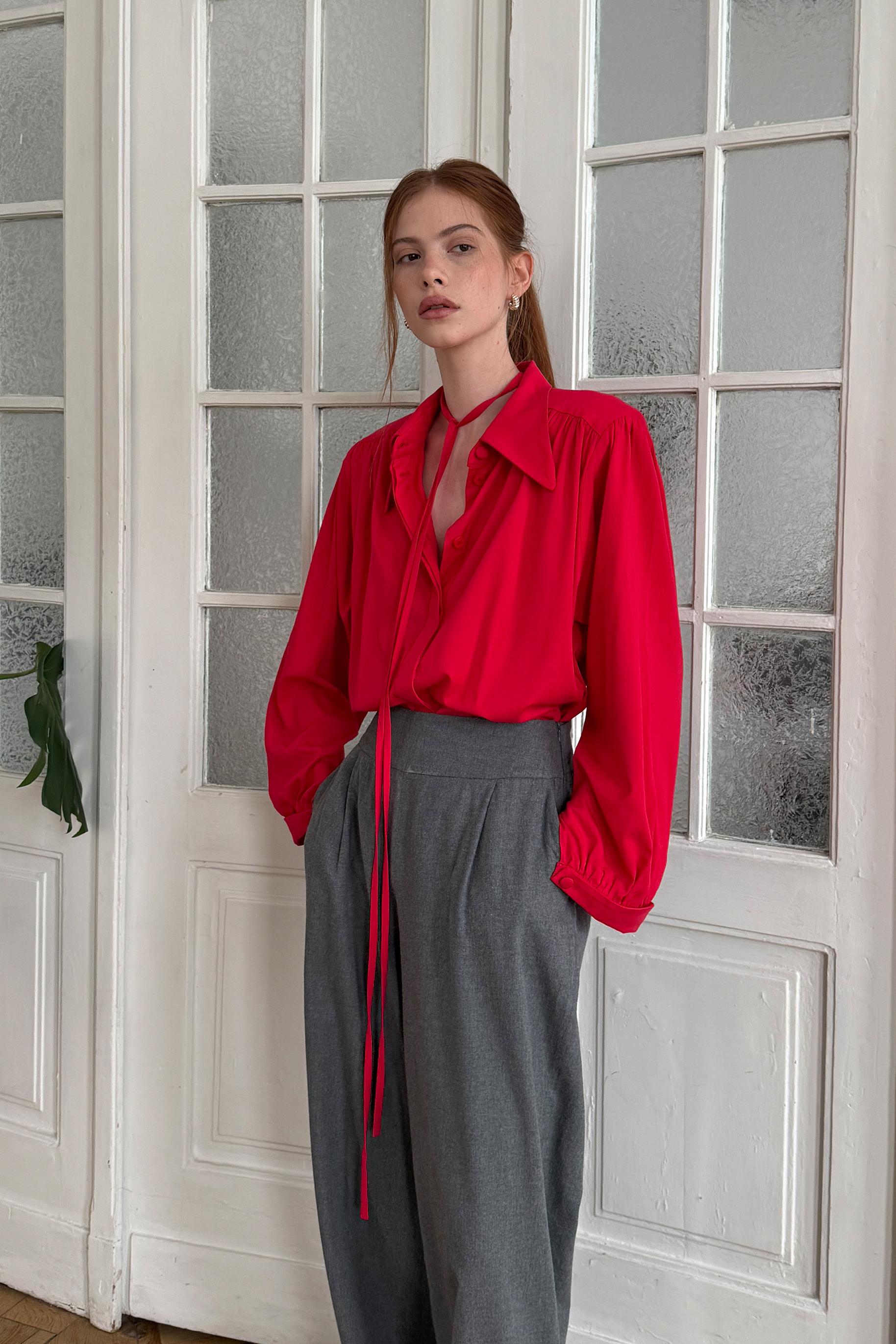 Koszula Scarlet swoją inspirację znalazła wśród modeli koszul z lat 60-tych. Lejąca tkanina w kolorze soczystej czerwieni oraz efektowne marszczenia na przodzie i tyle nadają koszuli szlachetnego charakteru. Polecamy nosić ją w zestawie ze spodniami lub spódnicą włożoną do środka. Wyciągnięta na wierzch pozwoli stworzyć luźny, nonszalancki look. Idealnie komponuje się z naszymi spodniami Suit, jeansami Denim oraz spódnicą Grid