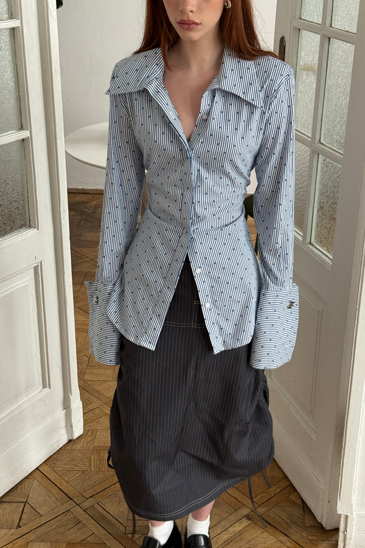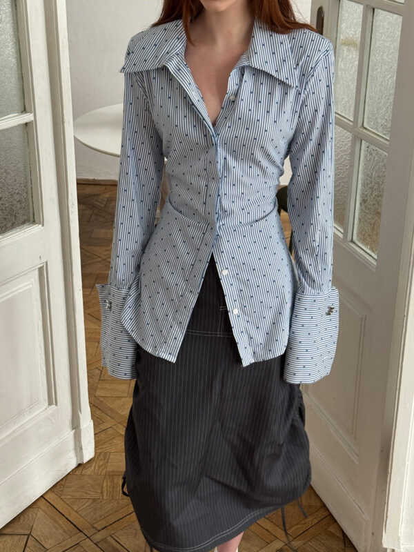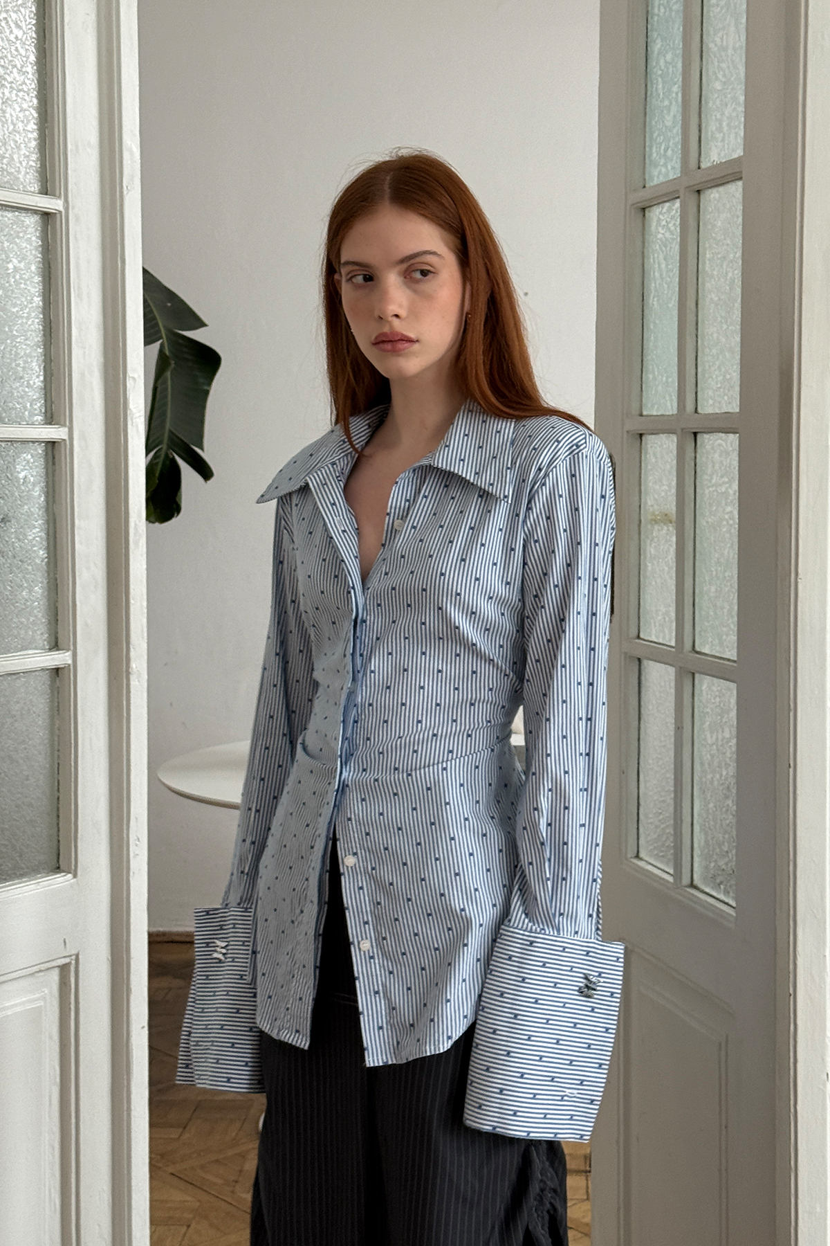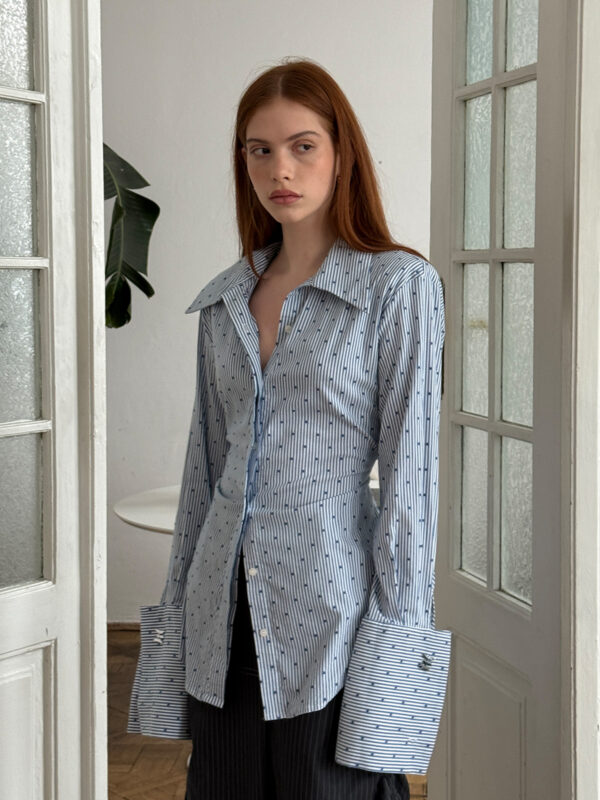 Dzięki wiązaniu na plecach możesz perfekcyjnie dopasować ją do swojej sylwetki, podkreślając talię, lub nosić zawiązaną luźno, uzyskując bardziej swobodny, minimalistyczny look. Szerokie mankiety zapinane na spinki naszego projektu możesz stylizować na wiele sposobów. Złóż je na pół i zapnij na jedną spinkę, aby subtelnie podkreślić nadgarstek. Dla większej swobody rozłóż mankiety i zapnij na jedną spinkę lub pozostaw je całkowicie rozpięte.